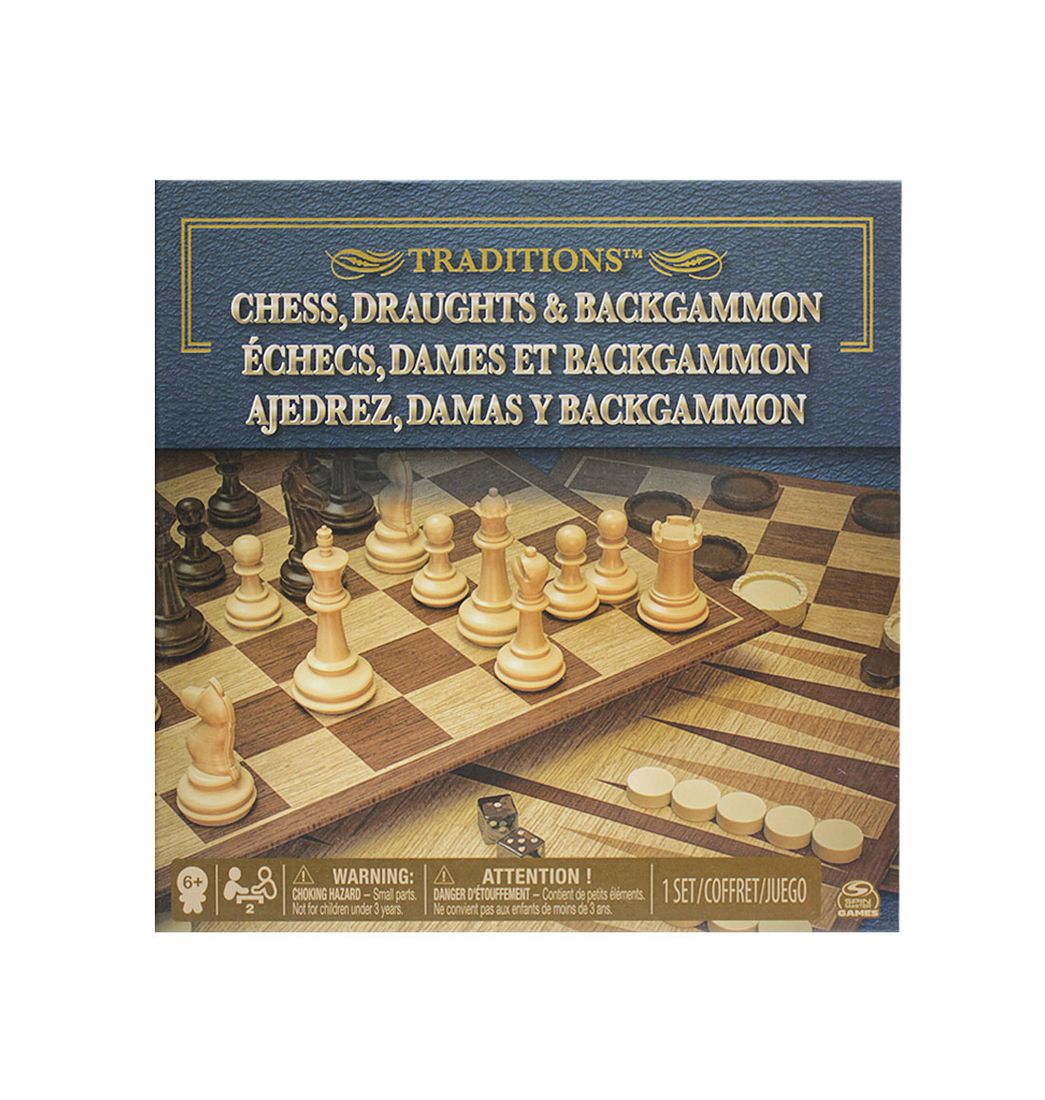 Incluye: 1 tablero de doble cara, 2 dados, 32 piezas de ajedrez, 30 damas/fichas de backgammon, 1 guía de instrucciones.