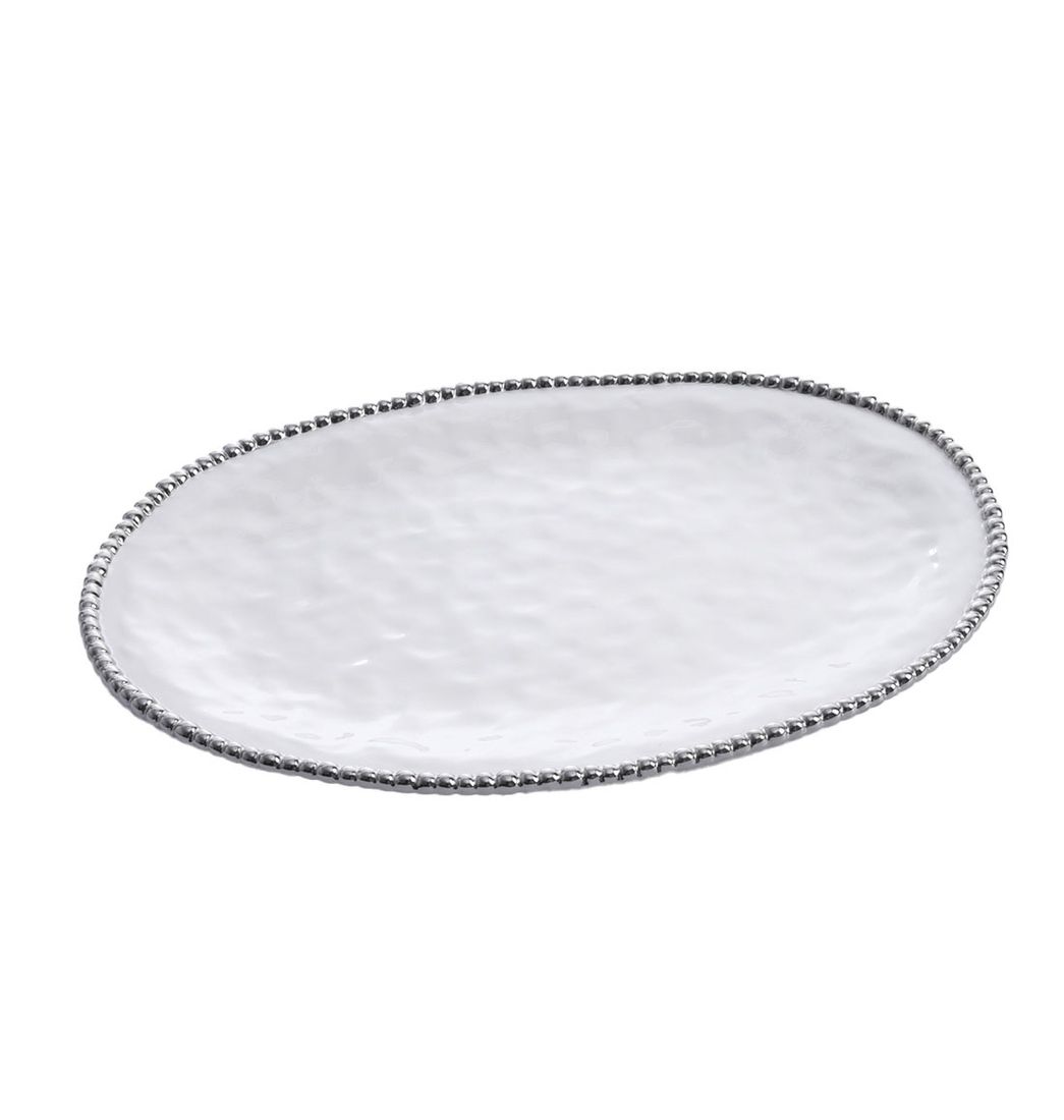 Este plato o bandeja ovalada para servir de la colección Salerno de Oven To Table, esta diseñada para ofrecer una presentación elegante y versátil en cualquier mesa. Fabricado en porcelana de alta cocción con acabado blanco y cuentas plateadas de titanio, esta pieza combina la estética de los muebles metálicos refinados con la practicidad de la cerámica duradera.