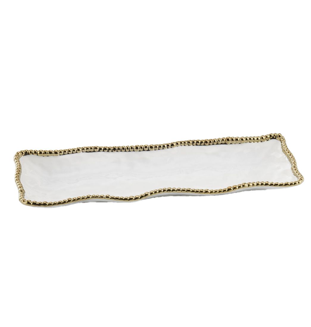 Esta pieza rectangular es ideal para presentar aperitivos, galletas, frutas o bocadillos, y su forma alargada es especialmente útil en buffets o mesas donde el espacio es limitado. La superficie blanca con detalles plateados realza la presentación de los alimentos y coordina con diferentes estilos de vajilla, desde los más clásicos hasta los contemporáneos.