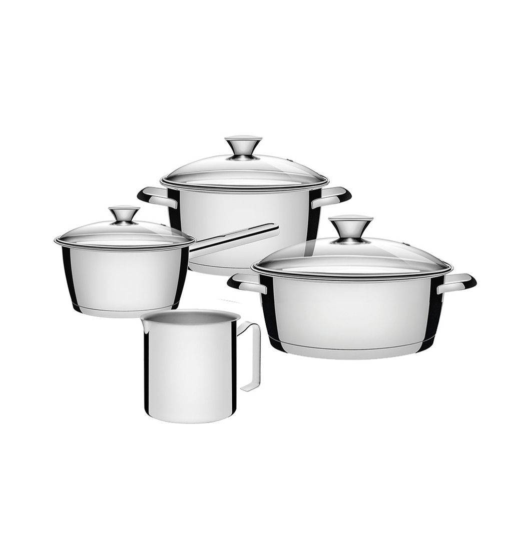 Incluye: 1 Olla 20 cm, 1 olla 24 cm, 1 perol, 3 tapas de vidrio, 1 hervidor.