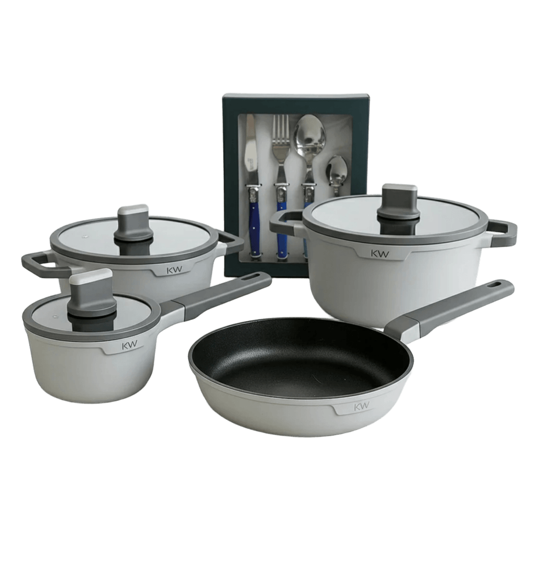 Batería de Cocina Chelsea 7 Piezas Aluminio Fundido + Set Cubiertos 24 Piezas Montpellier Azul - KW