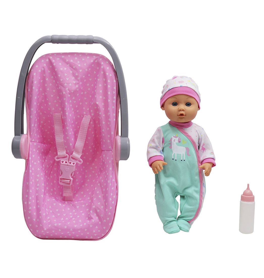 Incluye: 1 muñeca, 1 portabebés, 1 biberón.