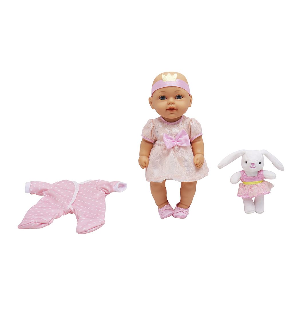 Incluye: 1 muñeca, 1 peluche, 1 muda de ropa extra.