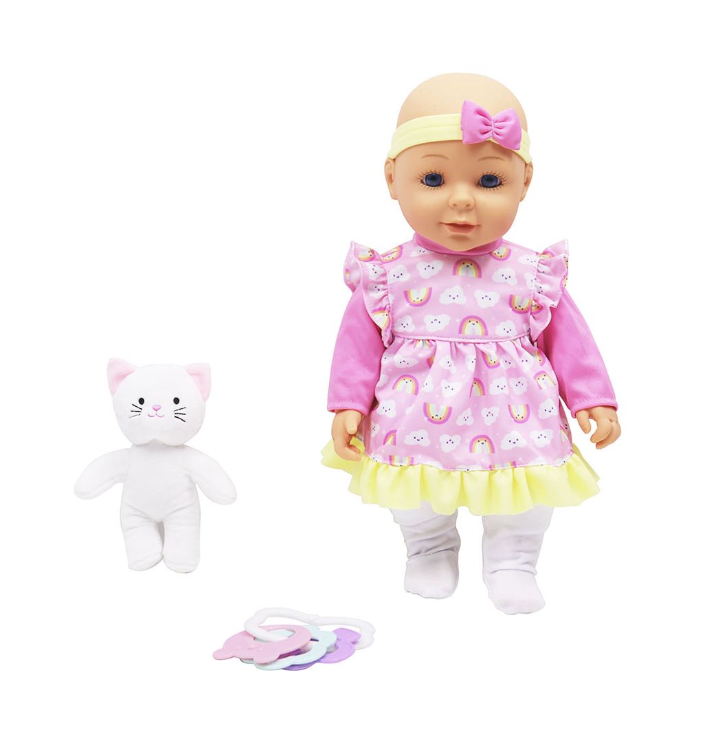 Incluye: 1 muñeca, 1 peluche y 1 sonajero con forma de llave.