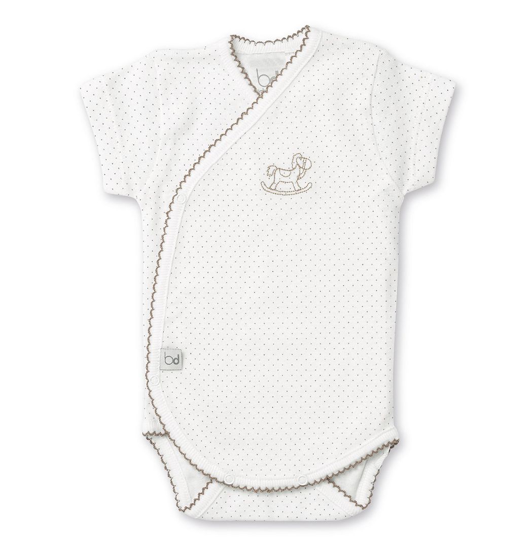 El diseño de pequeños lunares y el bordado de caballito balancín aportan un toque dulce y elegante. Ideal para cualquier estación, este body es fácil de poner y quitar, lo que lo convierte en una prenda funcional para el día a día. Los acabados en ondas contrastadas realzan la calidad del diseño, garantizando durabilidad y estilo.