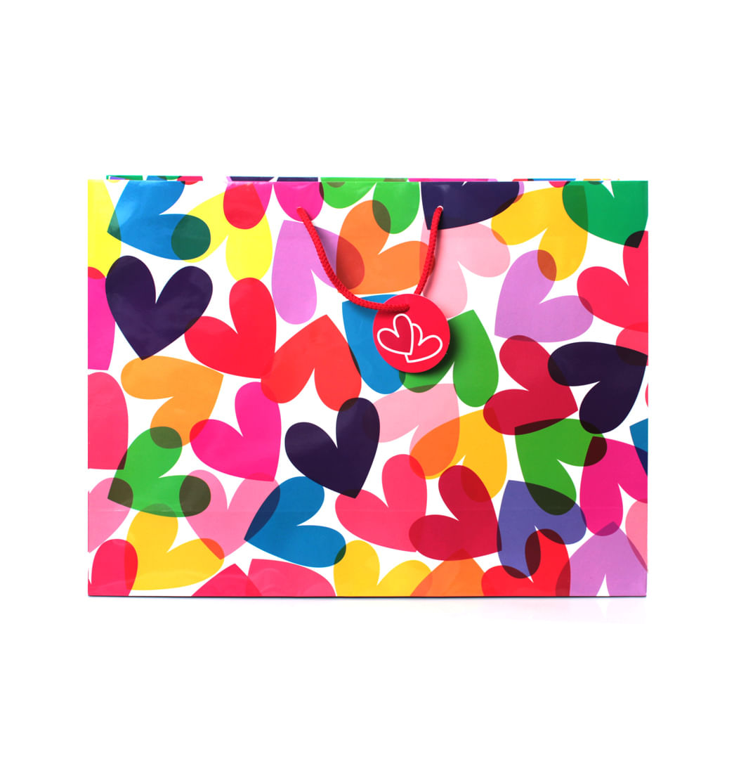En esta espectacular bolsa con lindo diseño de corazones podrás empacar el regalo para entregarle a una persona especial dándole un estilo único y tierno, además tiene cordel para cargar y un material resistente de mayor duración ¡Anímate a llevarla!