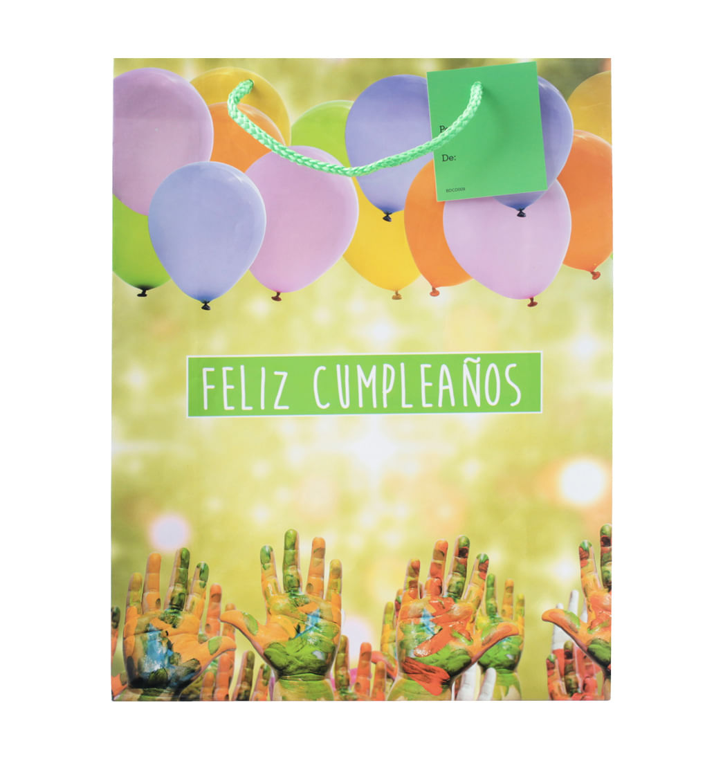 Esta bolsa con espectacular diseño de globos y manos es ideal para que empaques los regalos de cumpleaños dándole un estilo único y moderno, además incluye tarjeta para que la marques y no le falte nada a tus obsequios ¡Anímate a llevarla!