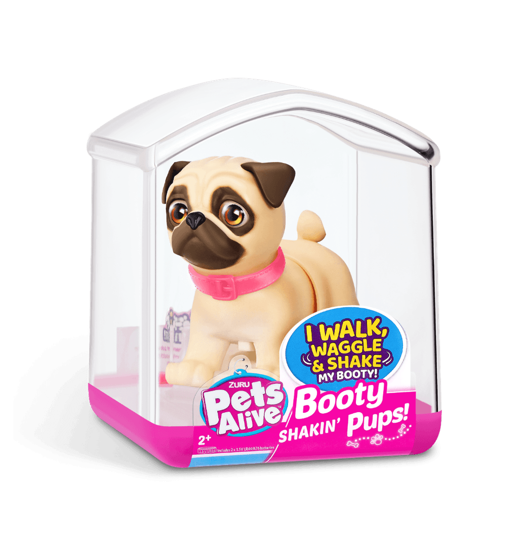 ¿Cuál elegirás? Enciende a tu cachorro de juguete y observa cómo camina mientras sacude su cuerpo y mueve su cola. Cada cachorro tiene su propio collar brillante removible y calcomanías adorables, y viene en su propio empaque de forma única, que también funciona como su pequeño hogar. Llévate a tu cachorro favorito a casa hoy.