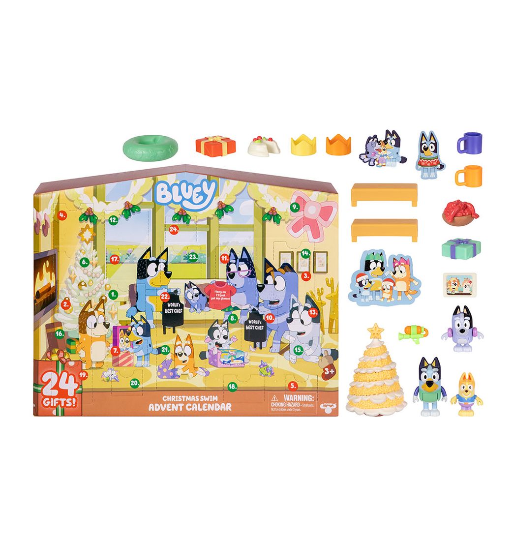 ¡Cuenta los días hasta Navidad con el Calendario de Adviento de Natación Navideña de Heelers y Bluey! Este paquete sorpresa muy festivo de Bluey tiene 24 sorpresas escondidas detrás de 24 ventanas diferentes.