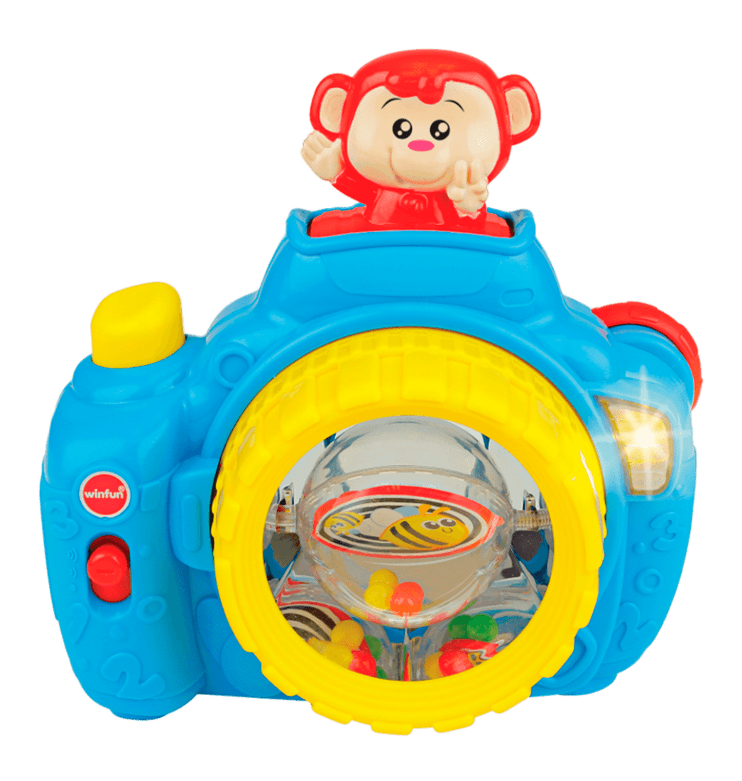 Jugar a ser fotógrafo se vuelve aún más divertido con Pop-Up Monkey Camera. Presiona el botón del obturador para ver el mono emergente y la lente giratoria. Además, libera divertidos sonidos, melodías y luces intermitentes.