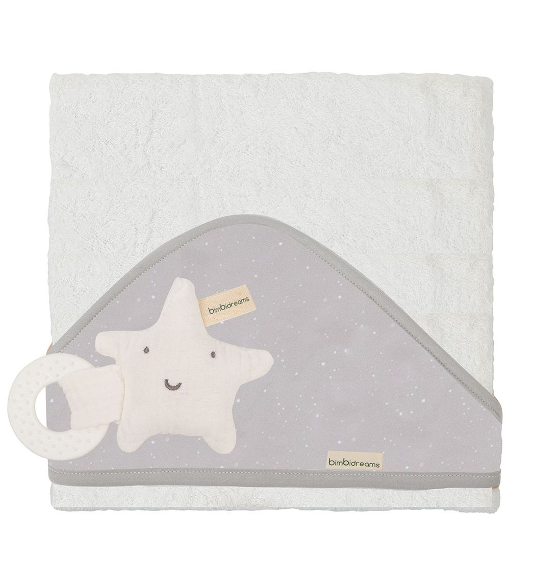 Su tamaño de 75x75 cm ofrece la cobertura perfecta para secar y abrigar, garantizando comodidad tras cada ducha. La capucha presenta un diseño estelar en tonos neutros que aporta un estilo dulce y moderno.