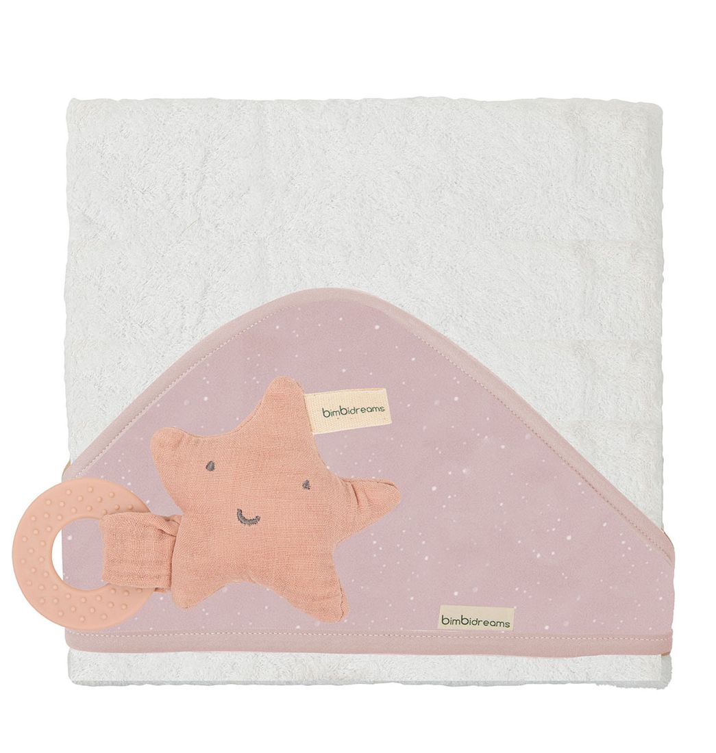 Su tamaño de 75x75 cm ofrece la cobertura perfecta para secar y abrigar, garantizando comodidad tras cada ducha. La capucha presenta un diseño estelar en tonos neutros que aporta un estilo dulce y moderno.