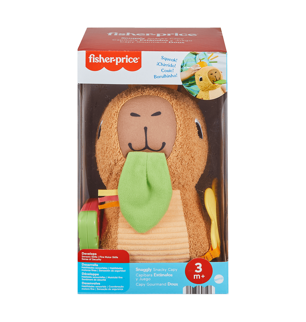 Lindo, adorable y listo para jugar, el juguete de peluche para bebé Capibara Estímulos y Juego de Fisher-Price está repleto de detalles sensoriales para que tu pequeño los explore. Con colores brillantes, tejidos texturizados y sonidos divertidos, el capibara viene con sus propios "snacks" diseñados para estimular los sentidos de tu bebé mientras juega.
