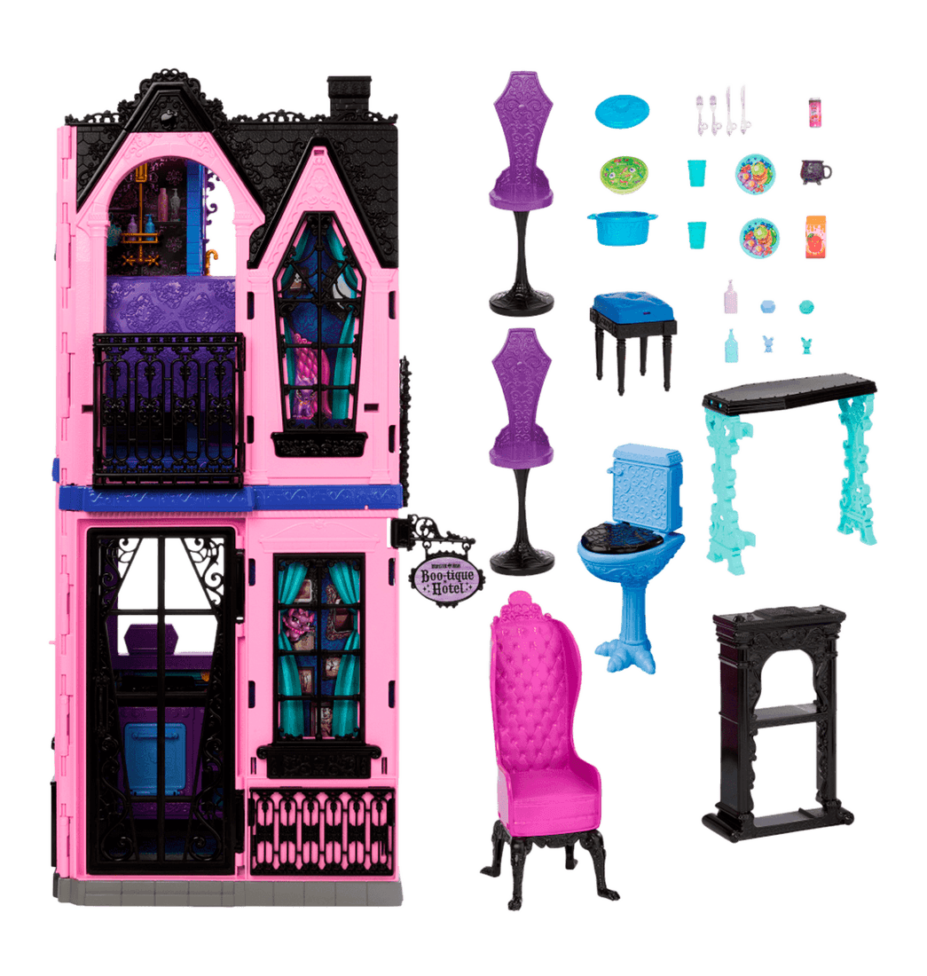 ¿Listo para una escapada espeluznante? ¡Regístrate para una estancia espantacular en el Hotel Boo-tique de Monster High! Esta encantadora casita de muñecas presenta sorpresas espeluznantes en cada habitación, además de más de 13 accesorios para estimular la imaginación.
