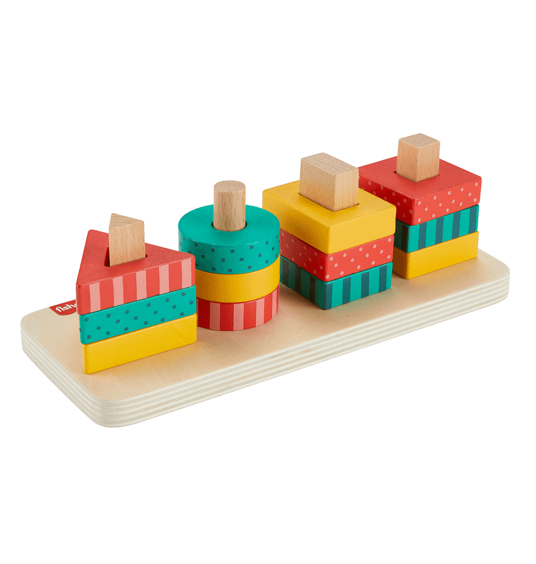 El Clasificador de Formas de Madera de Fisher-Price presenta coloridos triángulos, círculos, rectángulos y cuadrados de madera para que los niños pequeños los clasifiquen y apilen sobre la base.