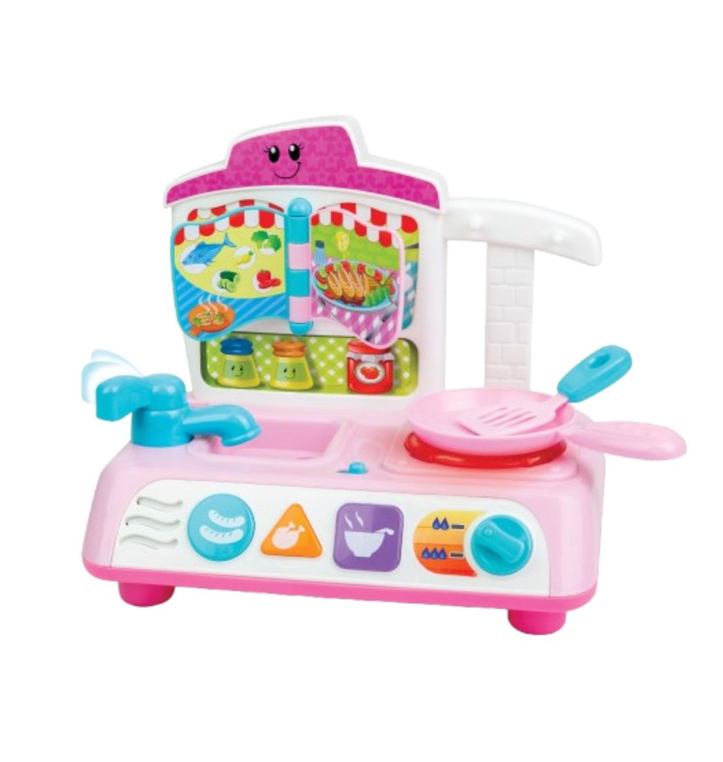 Incluye Cocinita interactiva con botones que enseñan formas y alimentos.
