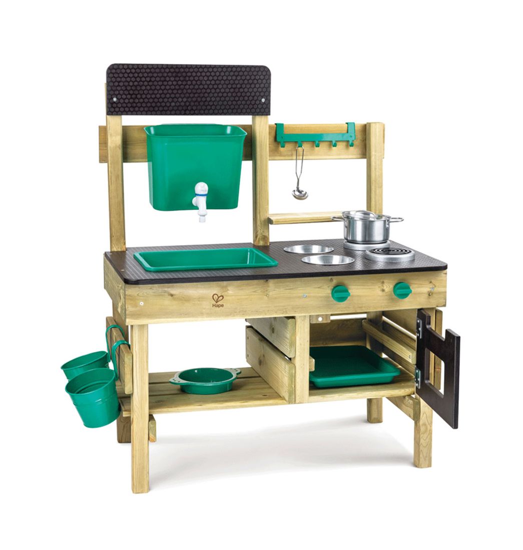 Invita a tus amigos a comer y cocínales algo al aire libre con esta fantástica cocina de juguete. Incluye multitud de accesorios de cocina, incluso macetas para que puedas poner tus propias flores y plantas. Fabricada con plástico de polietileno (PE) ecológico en color verde y madera certificada FSC.