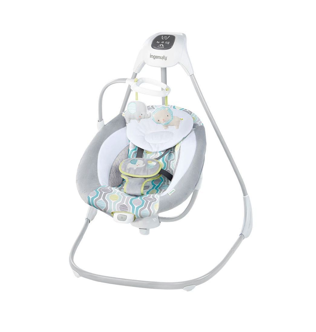El Columpio para Bebé compacto Ingenuity SimpleComfort gira 180 grados y se balancea en 3 direcciones; balancee a su bebé con comodidad con 6 velocidades, 8 melodías, 3 sonidos de la naturaleza y ruido blanco.