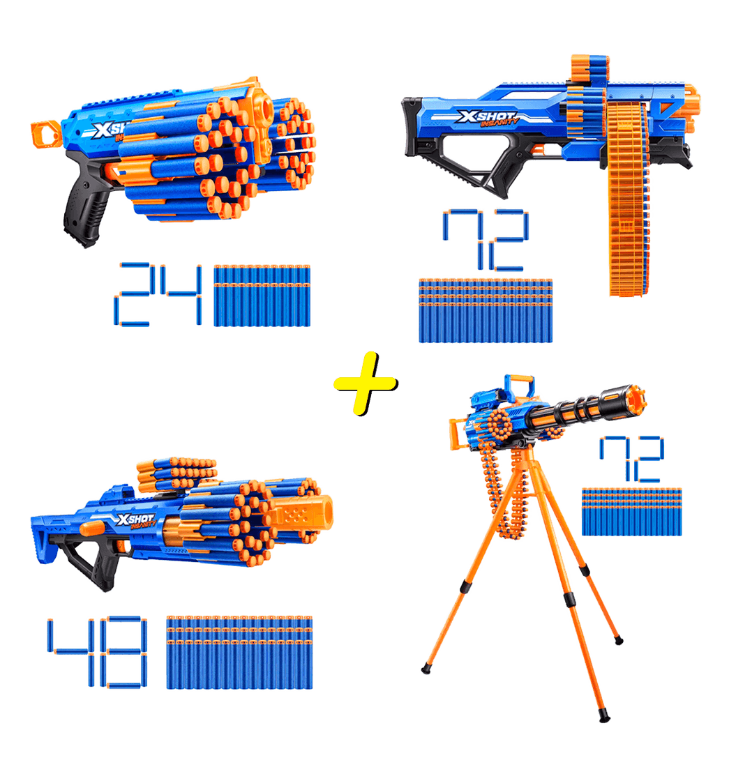 ¡Prepárate para la batalla más épica con este combo de lanzadores de XSHOT Insanity Estos lanzadores te harán vivir las mejores batallas y podrás descubrir accesorios insólitos y divertidos, incluyendo módulos de almacenamiento con capacidad para dardos adicionales, para que nunca te falten municiones durante el combate.