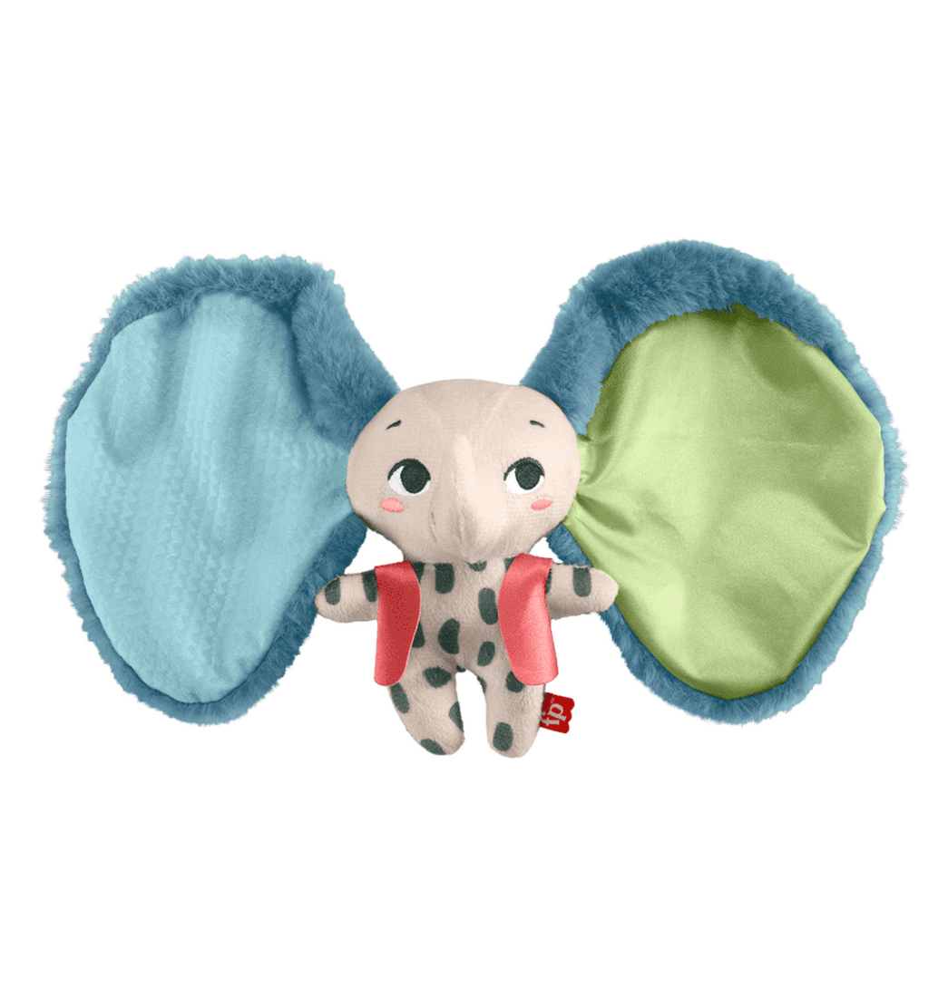 El juguete sensorial Elefante Orejitas Amorosas de Fisher-Price utiliza tela fabricada con un 90% de plásticos reciclados posconsumo y viene en un empaque con certificación FSC. Este juguete de felpa tiene orejas de gran tamaño suaves y cómodas y un chaleco satinado perfecto para que los dedos pequeños lo exploren.