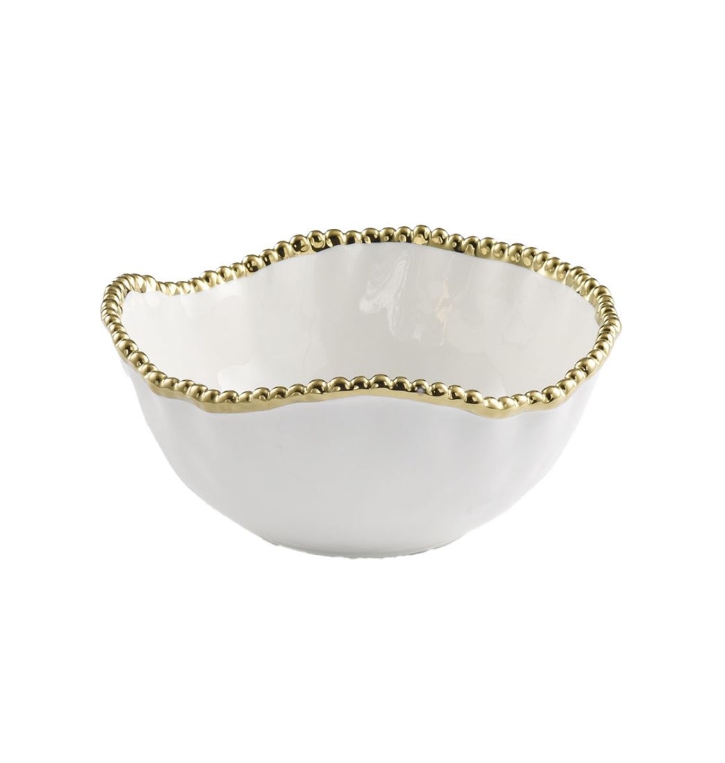 Fabricada en porcelana de alta cocción con un borde decorativo de cuentas de titanio en acabado plateado, este recipiente destaca por su aspecto sofisticado sin perder la funcionalidad diaria.
