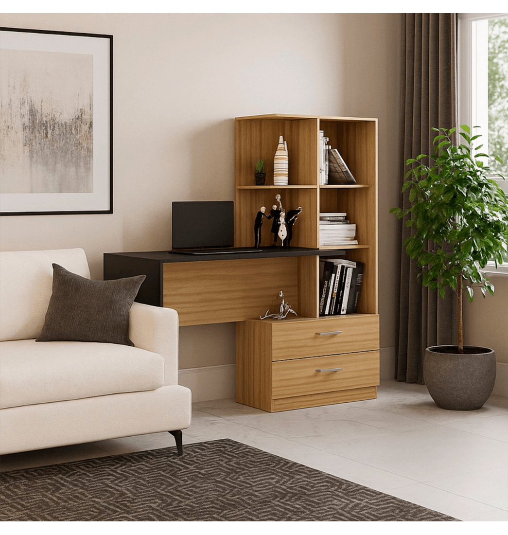 El escritorio con biblioteca Poli es la opción ideal para quienes buscan optimizar, decorar y ambientar su espacio de trabajo o estudio. Gracias a su diseño innovador y multifuncional, este mueble combina en una sola pieza un escritorio amplio y una biblioteca con estantes, lo que permite mantener todo en orden mientras aprovechas mejor el espacio disponible.