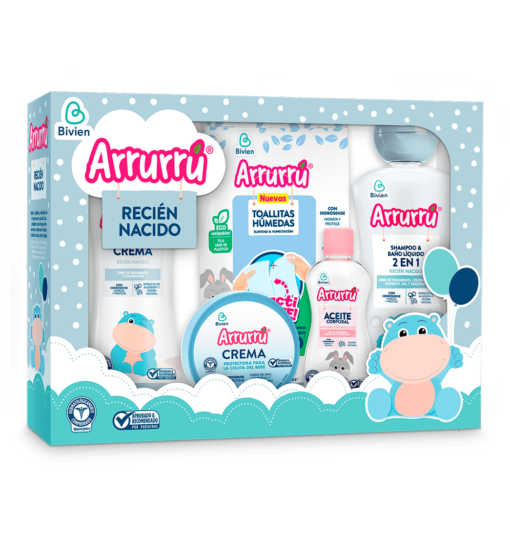 Incluye: 1 Shampoo Arrurrú 2 en 1 recién nacido 220 ml, 1 crema Arrurrú recién nacido 220 ml, 1 aceite corporal Arrurrú suavidad y humectación 50 ml, 1 crema protectora de la colita Arrurrú 25 gr, 1 toallitas húmedas Arrurrú 20 unds.