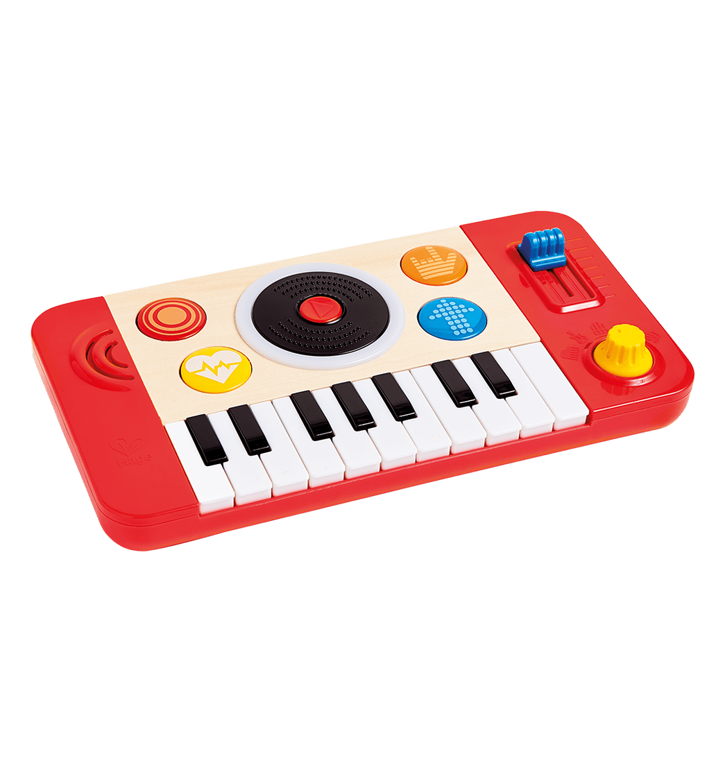 ¡Ayuda a tu pequeño a mezclar sus primeras canciones con este estudio de DJ portátil! Tu niño podrá tocar el teclado con uno de los cuatro sonidos instrumentales o 18 divertidos efectos de sonido, o puede iniciar una de las 5 canciones de fondo y utilizar el deslizador de tiempo para cambiar la velocidad, añadir efectos de sonido DJ ¡y mezclar el vinilo!