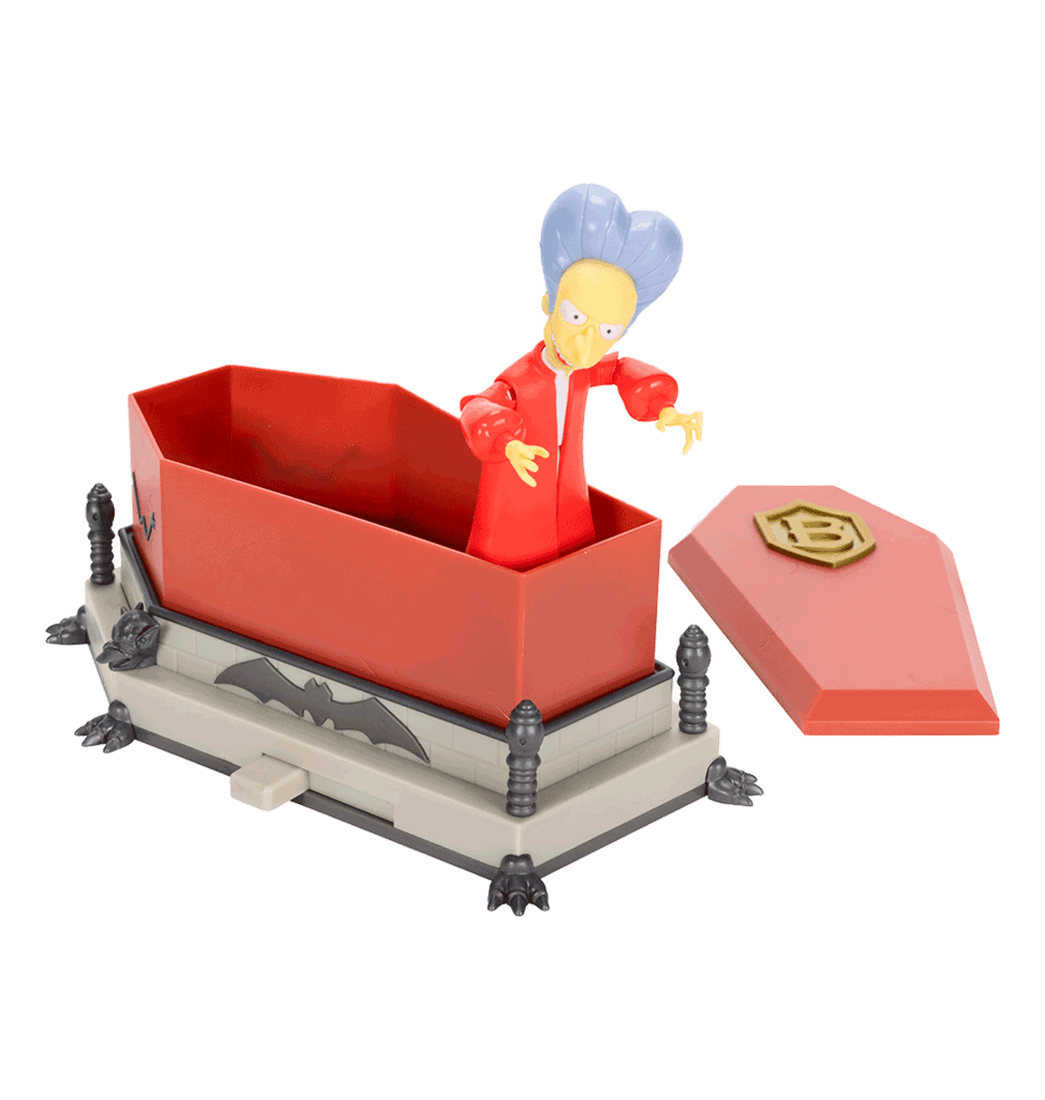 Como cualquier vampiro, es sensible a la exposición a la luz UV y presenta un rostro y manos que cambian de color si está fuera del ataúd durante demasiado tiempo. El vampiro Mr. Burns incluye un ataúd con tapa extraíble y cuenta con un botón deslizante para que aparezca y resucite de entre los muertos.
