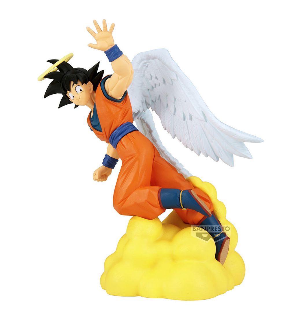 La figura muestra a Son Goku Ángel con una pose dinámica y heroica, listo para enfrentar cualquier desafío. Su traje naranja está esculpido con gran detalle, destacando cada pliegue y textura. La expresión facial de Son Goku transmite serenidad y determinación, reflejando la fuerza interior de este personaje legendario.