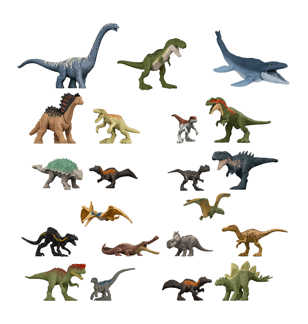 La colección de estas miniaturas puede inspirar emocionantes juegos de batallas de dinosaurios o una atractiva exhibición. Cada paquete contiene 1 especie de minidinosaurio extragrande o 1 minidinosaurio grande y 1 minidinosaurio pequeño o 2 minidinosaurios medianos.