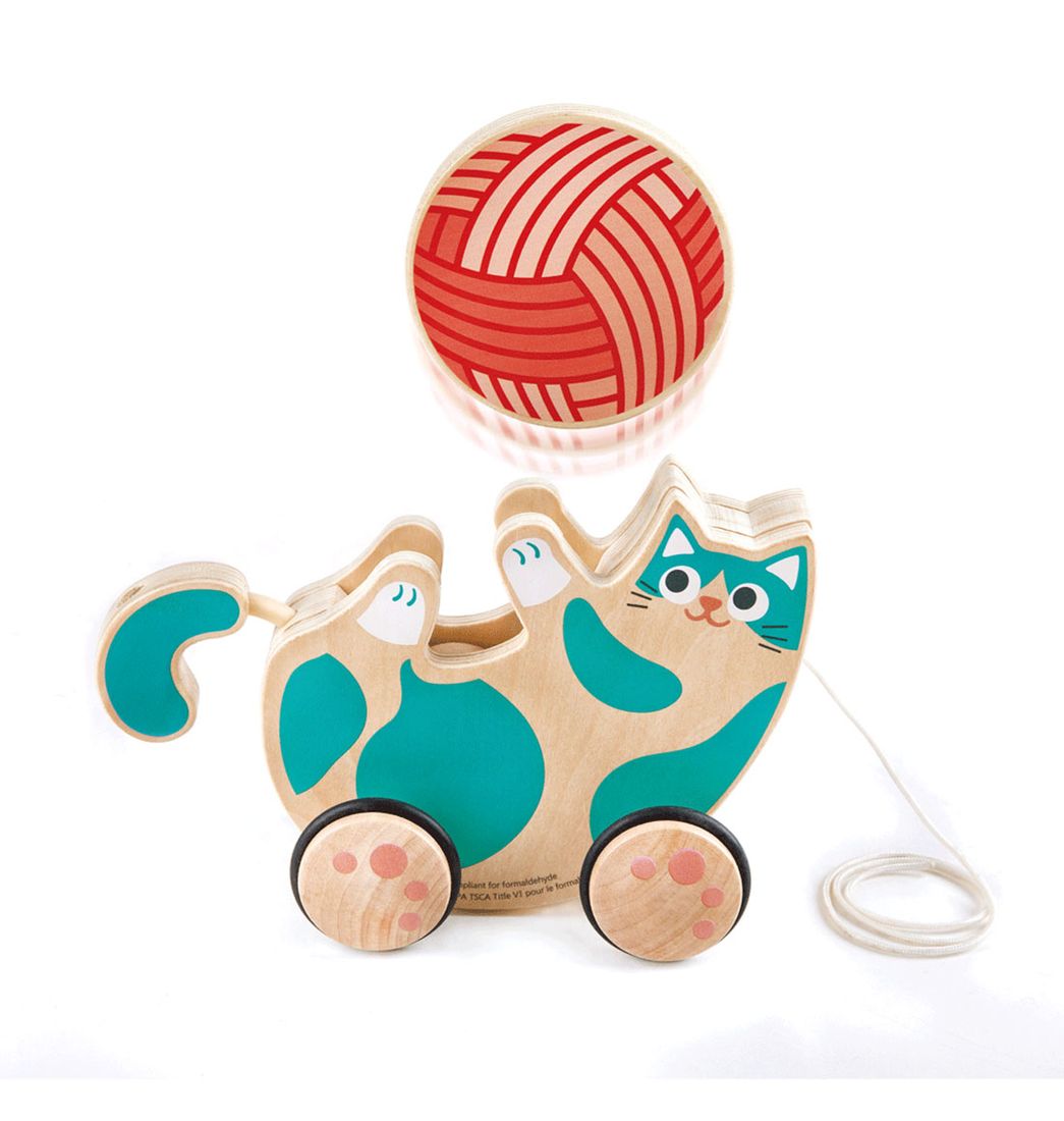 ¡Este precioso y divertido gatito de juguete no quiere dejar de jugar con su ovillo de lana! Tira de él por el suelo con la cuerda para ver cómo mueve la cola y hace girar el sonajero de lana entre sus patas.