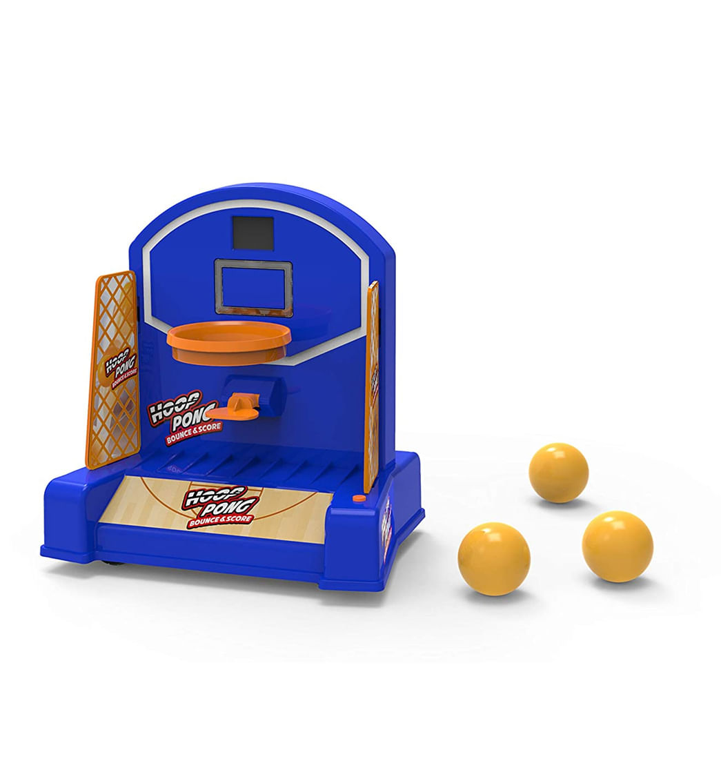 Hoop Pong es un nuevo juego que combina 2 deportes desafiantes: ¡Ping Pong y Baloncesto! La cancha de baloncesto motorizada se mueve de izquierda a derecha para disfrutar de un juego divertido. Cuenta con un contador de puntuación electrónico y entretenidos efectos de sonido alentadores. Este juego es ideal para niños y adultos. Divierte en familia o con tus amigos y ¡Anímate a llevarlo ahora!