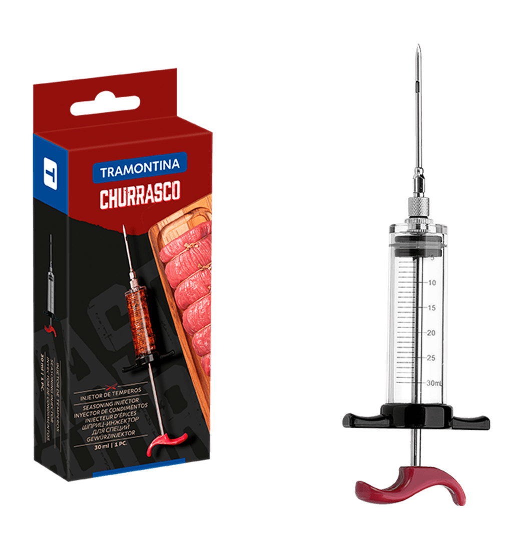 Deje tus carnes todavía más sabrosas con el inyector de condimentos Tramontina de 30 ml, el cual te permitirá agregar los condimentos directamente dentro de la carne, siendo ideal para asados al fuego o al horno. Este inyector se fabrica con cuerpo de acrílico y polipropileno, su puntero inyector y eje son de acero inoxidable, materiales que garantizan su durabilidad y calidad. ¡Anímate y adquiérelo ahora!.