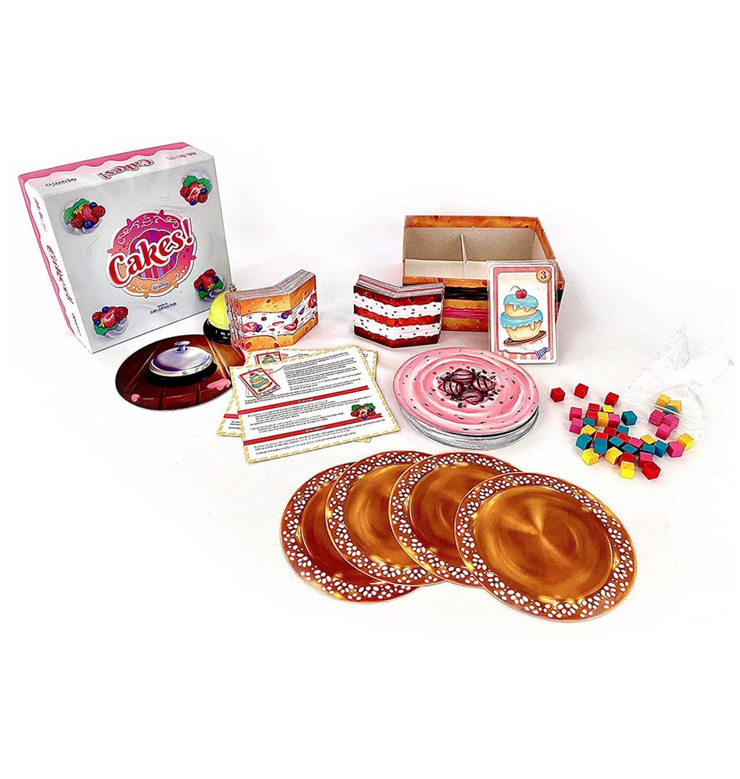 Número de piezas: 40 cartas de cobertura, 80 cartas bizcocho, 4 bases de plato, 40 Cubitos de colores, 20 cartas de pedidos, 1 Timbre, 1 reglamento.