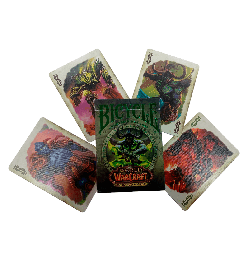 Los naipes Bicycle World of Warcraft vienen en 3 ediciones y la edición Burning Crusade presenta ilustraciones publicadas por World of Warcraft y una lámina dorada con magníficas ilustraciones personalizadas de WoW en todas partes.