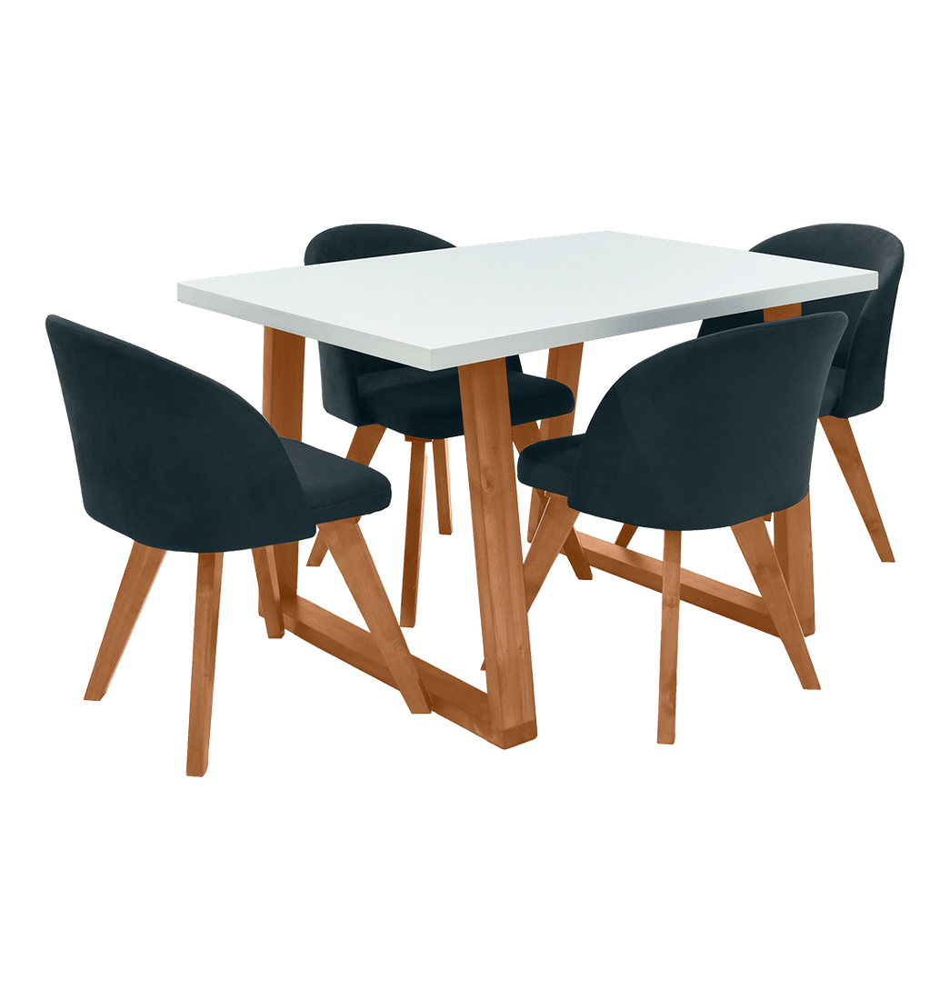Este Juego de Comedor contemporáneo y cómodo cuenta con una mesa andara 4 puestos, esta elaborada en una fuerte estructura de madera pino inmunizada naturalmente, además tiene una superficie en MDF pintado. La silla está fabricada en estructura metálica, asiento en MDF, relleno en espuma de alta densidad, y tapiz en tela poliéster de excelente calidad junto con patas en madera pino. ¡No esperes más y adquiérelo ahora mismo!.