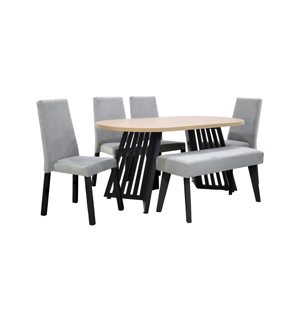 Este comedor cuenta con una tapa ovalada fabricada en madecor de 15 mm de espesor, con reengruese en MDF de 18 mm para mayor resistencia y durabilidad; el acabado del borde es canto flexible. Las patas de la mesa están elaboradas en pino con un estilo de rejilla que le otorga un toque distintivo y moderno. Además, cuenta con niveladores en la parte inferior garantizando así una superficie estable y equilibrada.