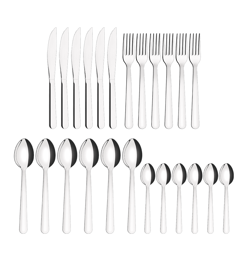 Para que tu mesa luzca perfecta, completa e impecable acompáñala con este asombroso Juego de Cubiertos, elaborados en acero inoxidable de alta resistencia y duración, haciendo que su limpieza sea más fácil y rápida, útil para servir, mezclar y manejar tus alimentos favoritas de manera sencilla y cómoda. El Juego de Cubiertos cuenta con cucharas con cuenca en formato simétrico y bordes cuidadosamente redondeados, tenedores con dientes pulidos en la parte interna y formato apropiado para la boca con bordes redondeados para proporcionar más comodidad en el uso y cuchillos totalmente templados, lo que le otorga más durabilidad al filo de corte dentado y más resistencia a la corrosión, adicionalmente, por sus características de templabilidad, no arañan la porcelana. ¡Llevarlos y dale un estilo sobrio pero elegante a tu mesa!