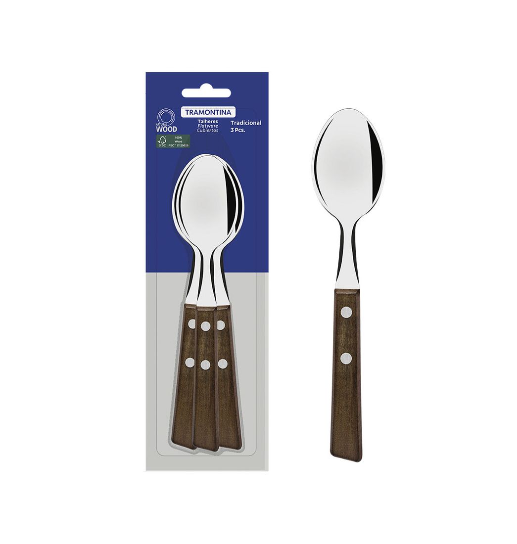 Juego de Cucharas de Mesa 3 Piezas Tradicional en Acero Inoxidable y Mangos Madera - Tramontina