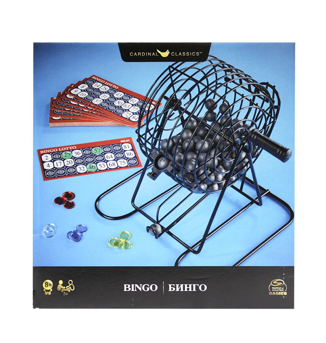 Incluye: 1 bombo de bingo metálico, 90 bolas numeradas, 1 tablero de bingo maestro, 24 cartones de bingo de doble cara, 150 fichas de bingo, 1 guía de instrucciones.