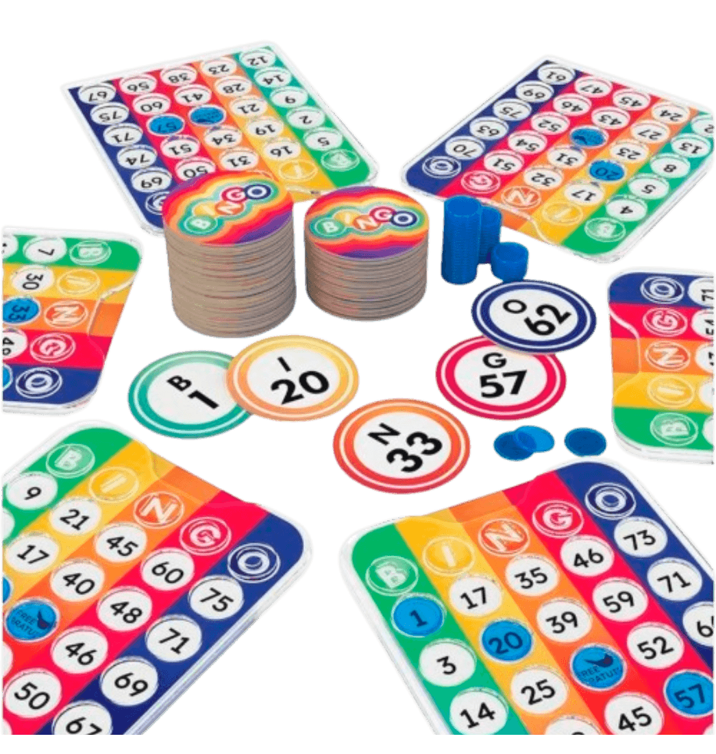 Incluye 75 tarjetas de bola de bingo, 18 tarjetas de bingo de doble cara, 6 soportes para tarjetas de bingo, 150 fichas, instrucciones.