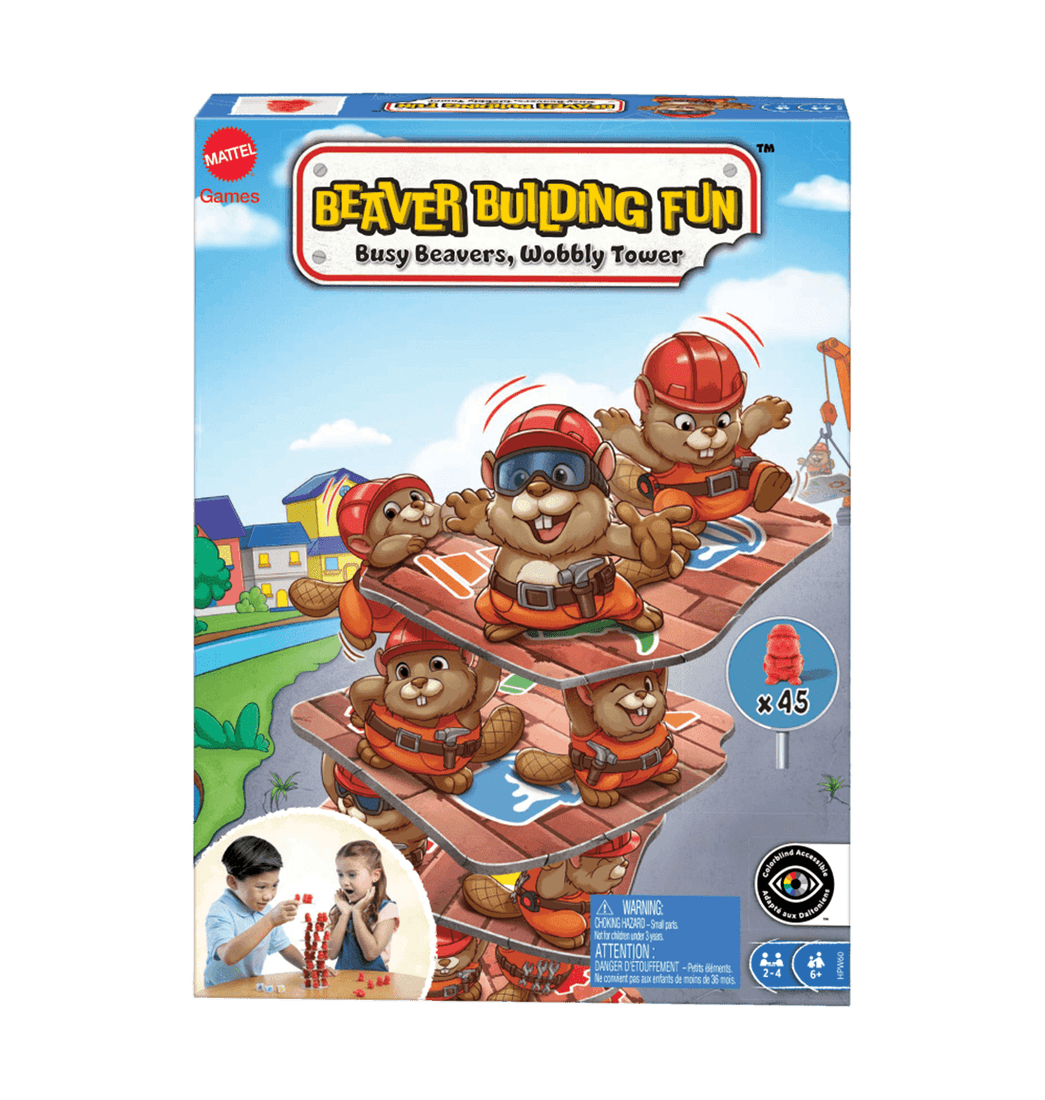 Llegó la hora de divertirte con los Castores Movedizos de Mattel Games. La tensión aumenta a medida que la tambaleante torre crece más y más, mientras los jugadores esperan a saber quién de todos la hará caer.