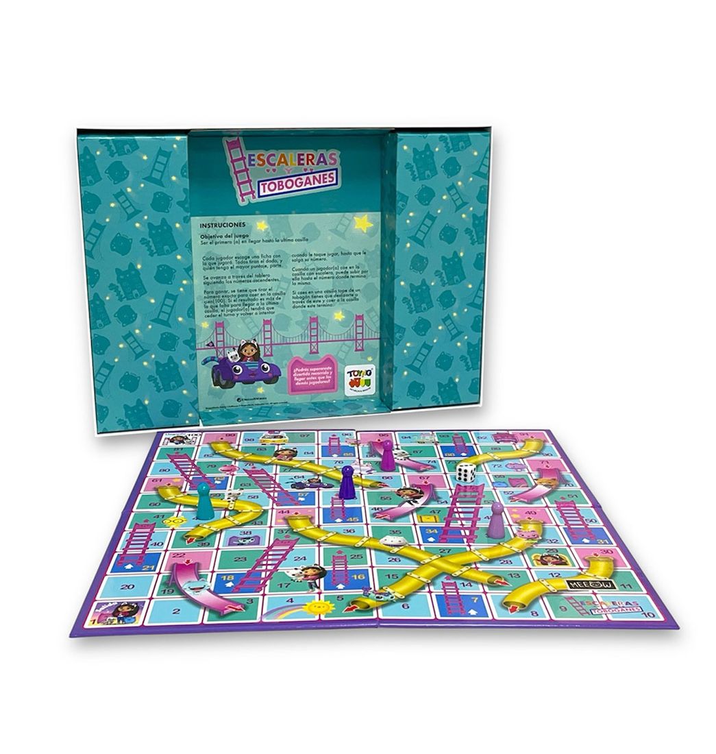 Este juego de mesa Escalera y Toboganes es un producto oficial de Gabbys Dollhouse diseñado para sumergir a los niños y niñas en el mágico mundo de la serie mientras disfrutan de una experiencia de juego única y enriquecedora.