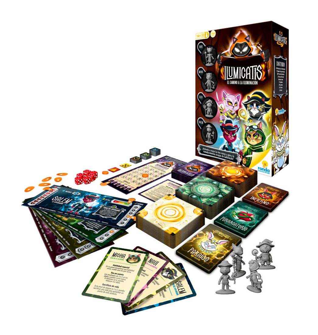 Incluye 4 Miniaturas Ilumicatis, 5 Paneles de Personajes, 28 Pines indicadores, 2 Fichas de Maná, instrucciones, 55 Tarjetas, 48 Losetas, 24 Tokens y 6 Dados.