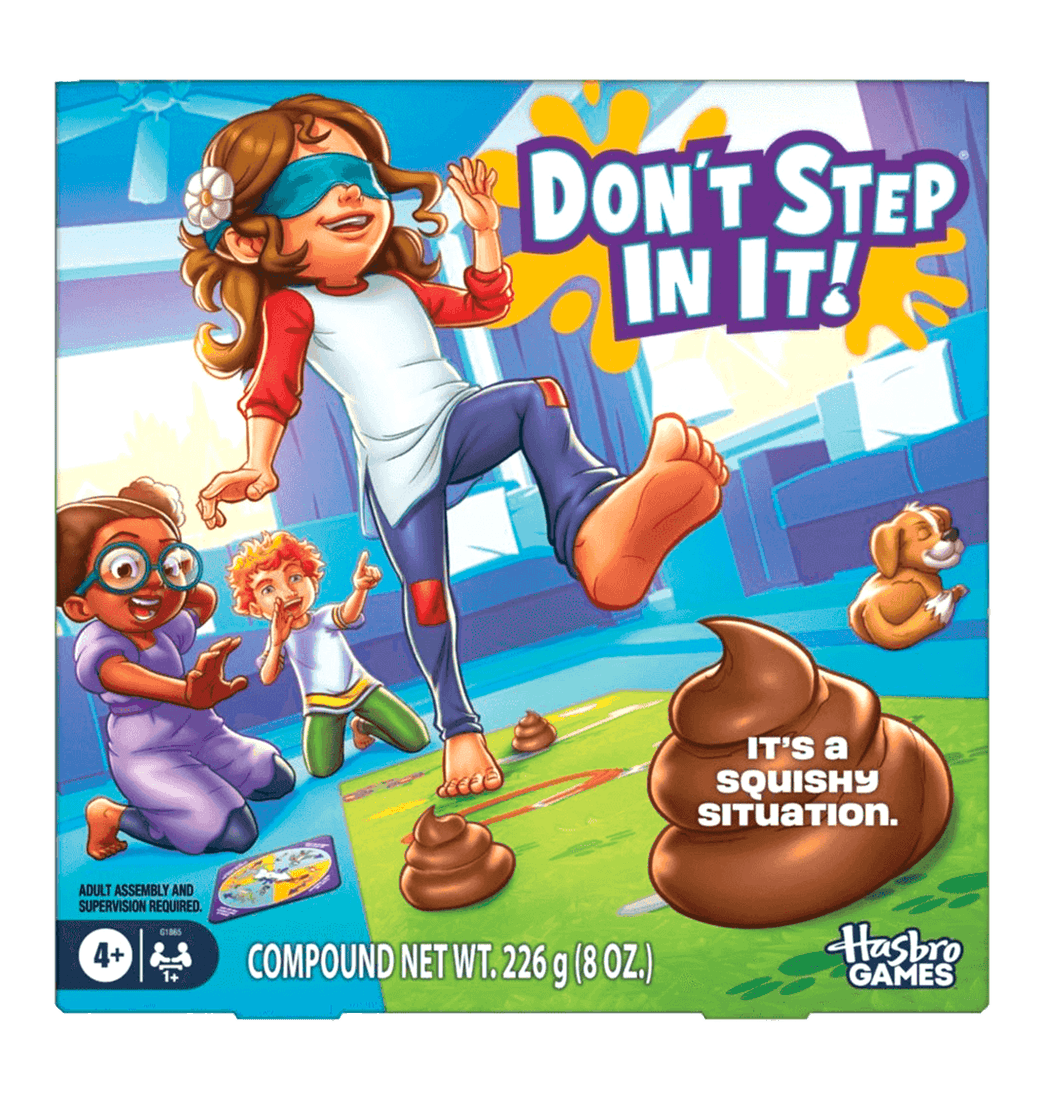 Es una situación aplastante. En el juego ¡Caca Chaf!, los niños tratan de no pisar las "cacas" al caminar por el mantel como animales mientras tienen los ojos vendados. Uno de los jugadores gira la ruleta para elegir uno de los 8 movimientos de animales, que incluyen saltar como una rana o caminar como un elefante.