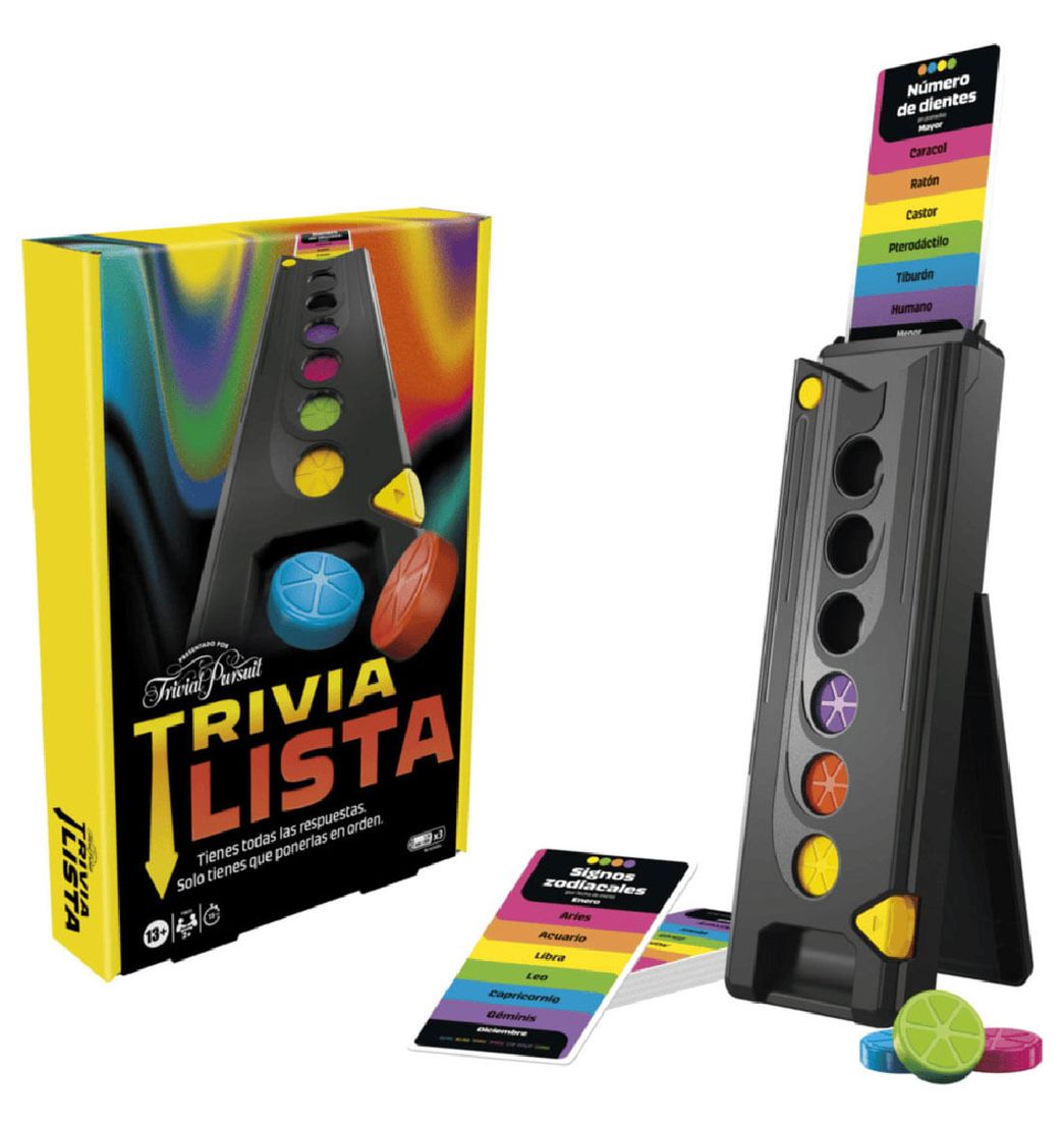 En el juego Drop Trivial, los jugadores tienen todas las respuestas, ¡solo deben colocarlas en el orden correcto! Este dinámico juego electrónico de preguntas se juega en apenas 15 minutos. Juega contra otro jugador o en equipos. En cada ronda, comienza colocando una carta de preguntas con 6 respuestas en la torre de juego. A continuación, cada equipo se turna para adivinar el orden correcto de las respuestas y acumular puntos.