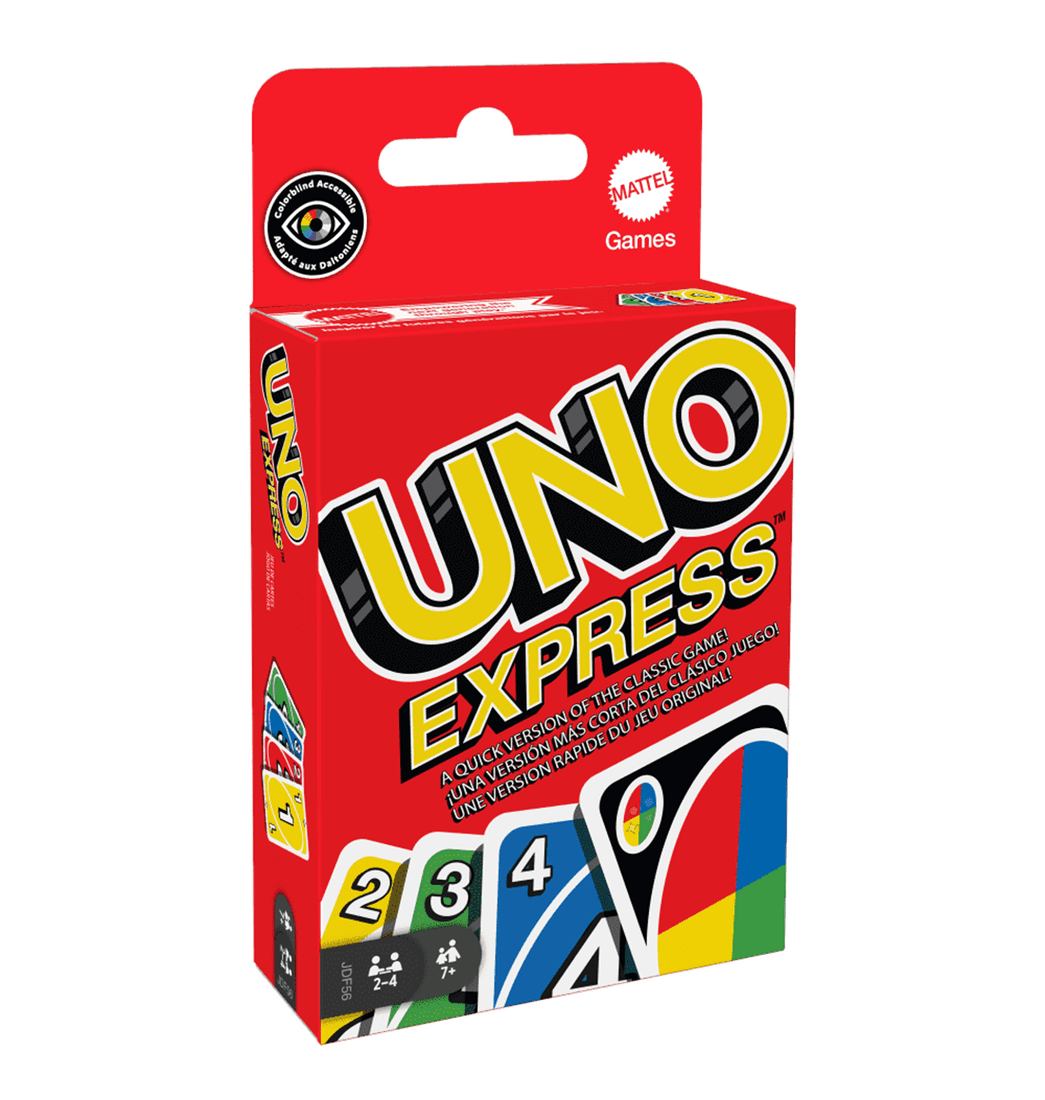 UNO Express ofrece toda la diversión de UNO, pero con un juego más veloz, ¡lo que permite a los jugadores terminar las rondas mucho más rápido! La baraja más pequeña, de 56 cartas, hace que esta versión de UNO sea portátil y fácil de llevar. Y cuando te quede una sola carta, no olvides gritar "¡UNO!".