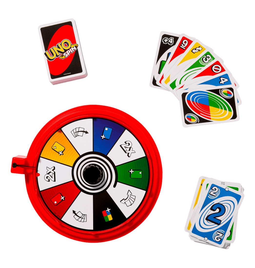 Incluye 112 cartas de UNO, 1 ruleta UNO Spin y un instructivo.
