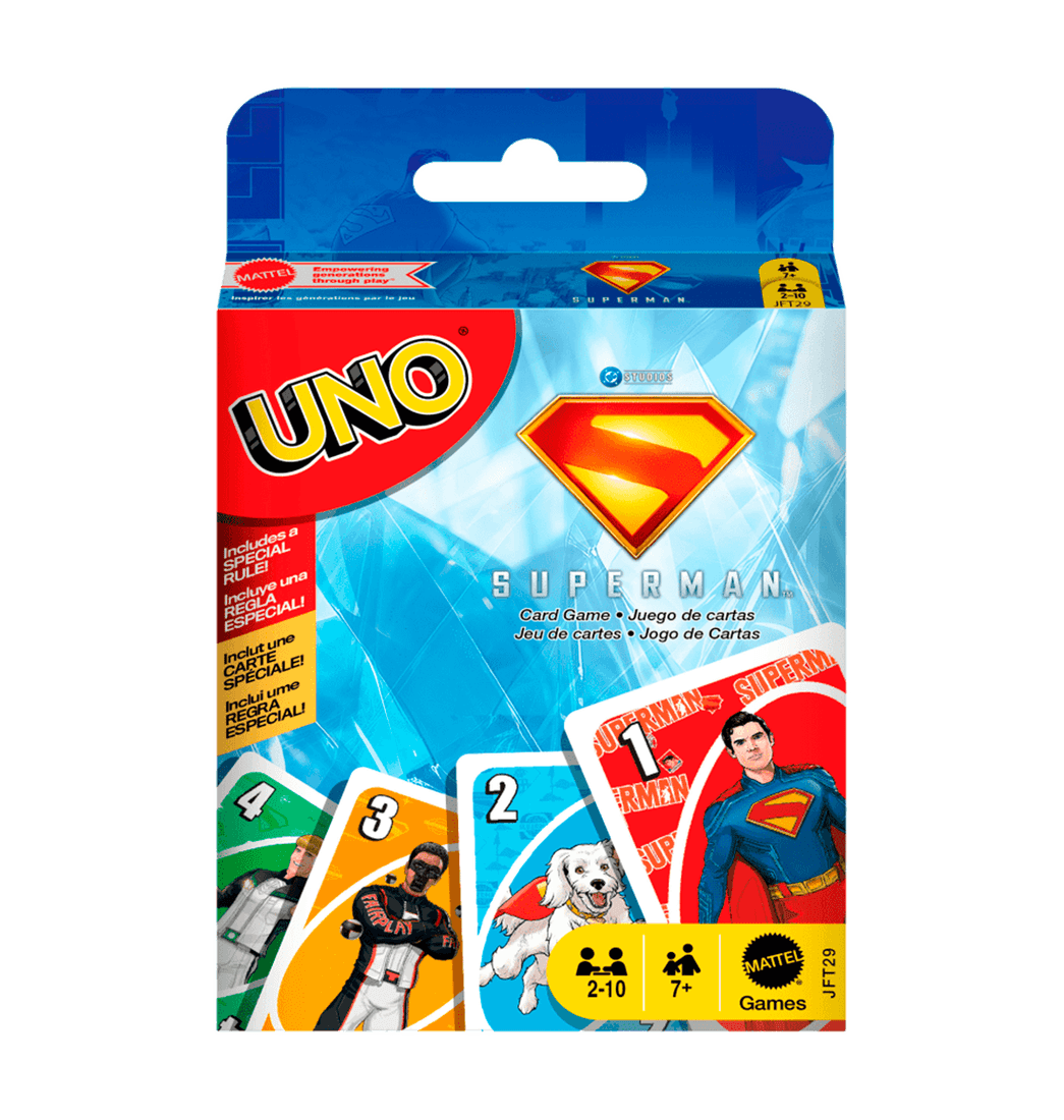 A los fans de Superman les encantará jugar con este juego de cartas UNO con temática del superhéroe. Con una baraja que incluye gráficos inspirados en sus personajes y escenas favoritas de la película, los jugadores deben hacer coincidir colores y números.